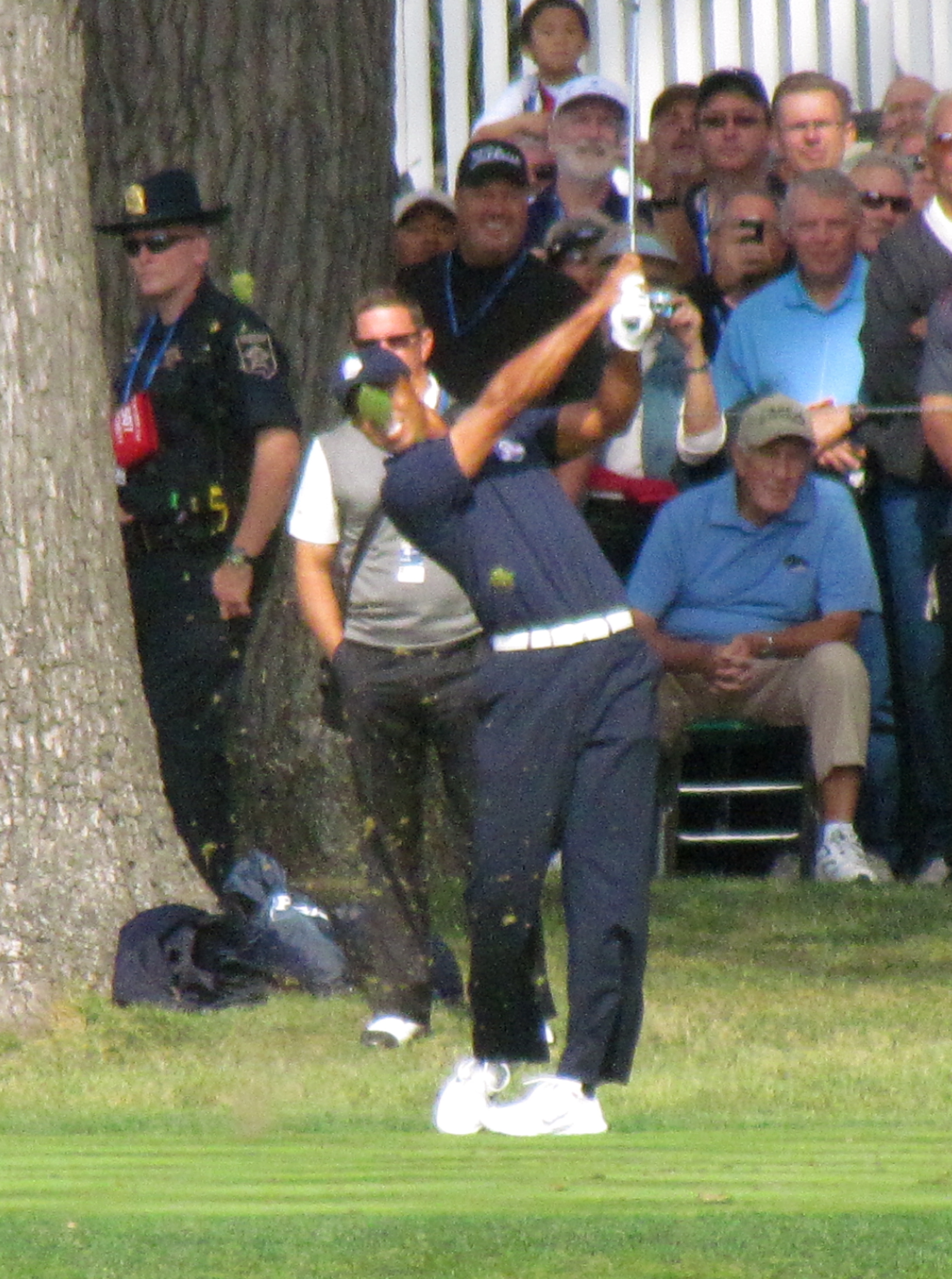 Once we scoped out the course and did some damage to our wallets at the golf shop, we found a great spot along the 2nd green. You could see the players tee off over the water and then they were putting right in front of us. We got there as the last European group was on the green and noticed how interactive they were with the fans when they moved onto the 3rd tee box. Excited by this, we got in position to watch all the Americans play this hole. I was able to get some great pictures all day of them playing (bonus of going to practice where cameras are allowed) and was hoping to get some autographs too for my flag. It was really impressive to watch the professionals hit the balls, and to be so close to them. When the first group was ready to move onto the next hole, the fans were disappointed to see that no one would stop for signatures while they barely looked at the crowd, other than to hand out a few hat pins. Unfortunately, the same practice took place with the groups that followed – other than a few who stopped to sign flags. At least I got to see all of my countrymen tee off then – including Tiger “grassface” Woods.