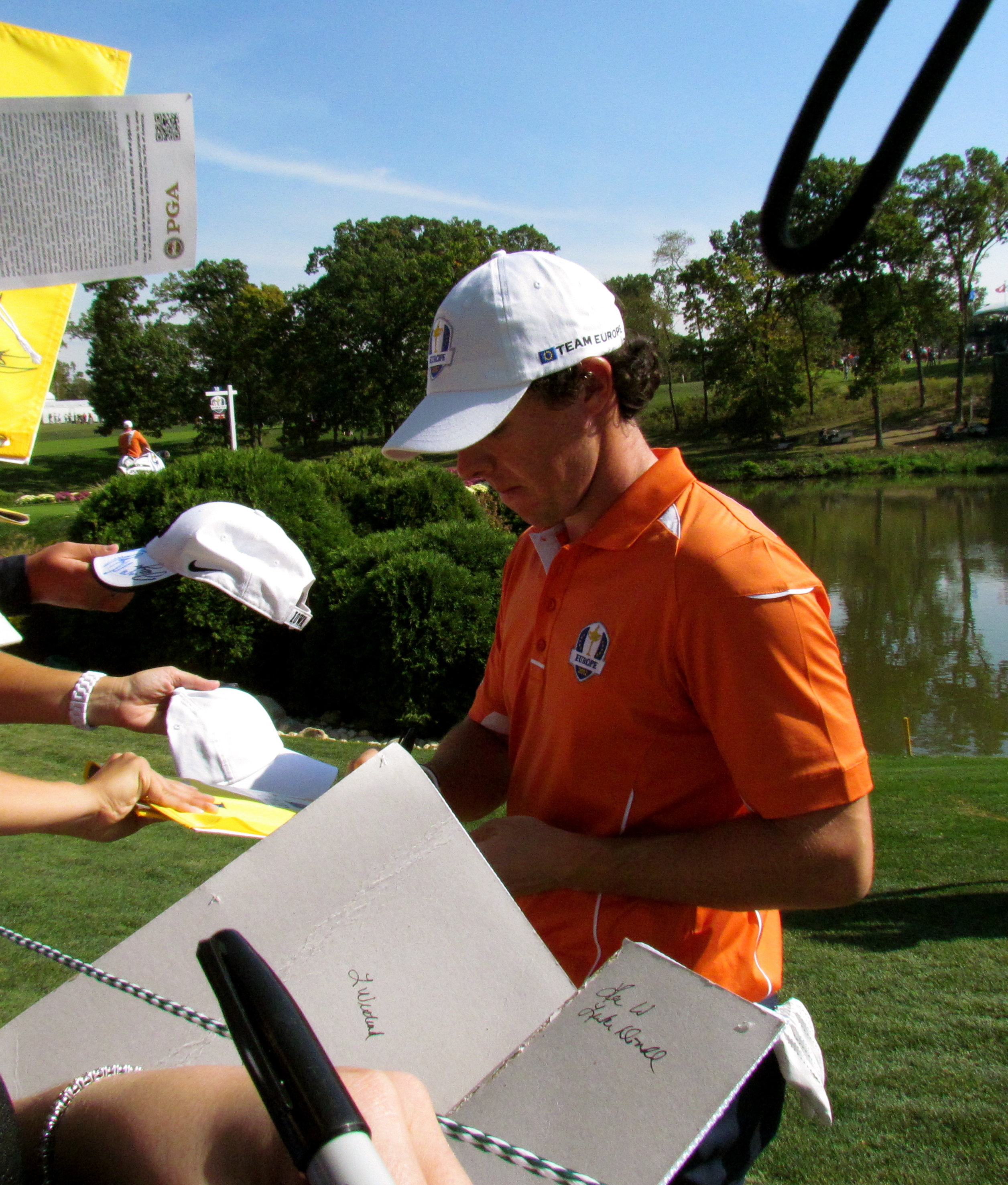 Frustrated, but not ready to give up, we moved on to the back 9. This time, we found a great spot along the 17th green where they would have to walk past us since there was just water on the other side. It was going to be perfect for autographs! However, this spot also came with a 2+ hour wait due to the super slow speed of play. I understand that this was the first time out practicing, but spending 20 minutes or so on each green to mess around based on future pin placements seemed excessive. This is one place where I thought Medinah was lacking – keeping everyone moving along, and informing the crowd of what was going on. It didn’t help that the screen by the water wasn’t working. Nonetheless, we were patient and then in a perfect place to see everyone putt and then walk past us.
